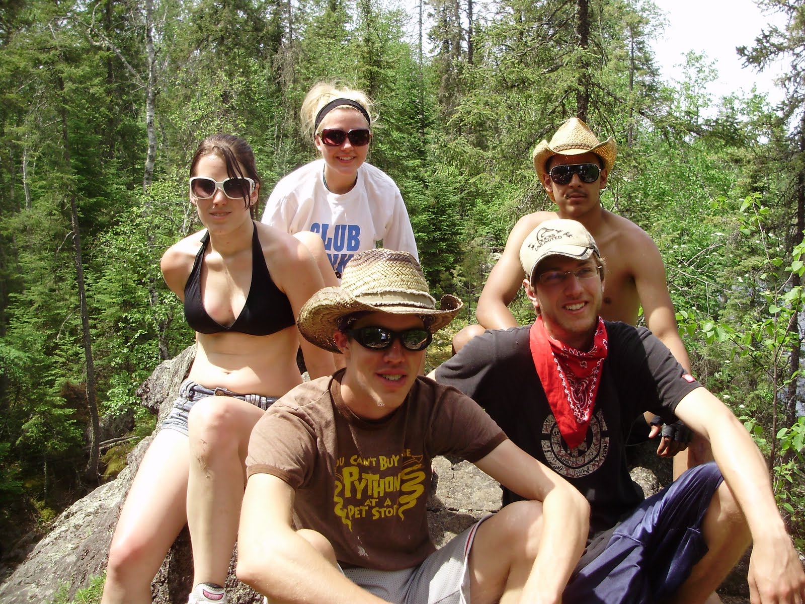 Rich and I paddled stern in the Souris River canoes with the girls, Kari and Kayla in the bow of each boat. The three boys paddled the Old Town Tripper with Adrian steering from the stern. Jake and Sam took turns in the bow. We made it to our camp in 2 1/4 hours. After camp was made we shared tortillas with salsa, hot sticks and cheese. The students went looking for fire wood and were gone an hour. They returned with no firewood but did have stories of their adventures navigating the circumference of the island on foot. We talked them into paddling around the island looking for wood. As soon as they left it was obvious they were going anywhere they wanted. They soon disappeared behind lady boot campsite. After a while they reappeared and made their way back to our campsite. They did have a little firewood they scavenged from a nearby campsite. They talked about visiting a place called Heaven. It was a pristine piece of woods near the channel to Lake Three. The girls made salads while the fire was started. Soon the steaks were sizzling and the potatoes were roasting in the coals. The meal was a little late in being served but tasted like we had gone to Wiederholts. I enjoyed a cleansing experience while washing dishes. At sunset the kids went to a huge rock across the channel and sat there in the evening glow for a long time. Rich went to his tent early and the students and I hung the food pack. It was 15 feet off the ground but only a couple feet from the tree. Bear proof 90%. We all slept in a little the next morning. For breakfast we had tortilla wrapped eggs, bacon, fried onions and cheese. Our day trip took us to the East side of Lake Three, where we walked the Pow Wow trail and viewed some historic logging camps. For the return trip paddling across Lake Three Rich and I paddled my Souris River while the 5 students paddled the Tripper. Actually the girls paddled and the boys rode duff. They swapped positions after crossing Lake Three because it was a huge load for the girls to paddle. Kincaid and I struggled to keep our balance for several reasons. Camp life took over with swimming, coffee, snacks and then a supper of Mac and Cheese with grilled hot dogs. Sam and I went fishing with Sam in the stern and me fishing from the front. Kayla fished while Kari powered the bow of their canoe. I had one small Northern steal my Mepps. The evening was cool with a gray overcast. Eventually it started to sprinkle and then with a full shower as we headed back to camp. We spent the evening under the tarp and talking until the full moon shown above the tree tops. Kincaid was cooking pancakes when I walked into camp at 9:30. He also handed me a cup of coffee. A good way to start the day. Our day trip had us paddling to "Dangerous Waters" which had a hiking trail along the east side of the rushing stream. We walked, photographed, and wondered at the beauty of this little known part of Lake Two. While taking group photos on top of a cliff over looking the rapids I realized that Jake had a wonderful camera. Father's day is soon and I will get one. We went back to camp and took a short break. It was a hot afternoon and the students and I went looking for a rock to jump into the lake from. We couldn't find a safe one at first and then Kincaid paddled out solo in the Tripper. He led us to a nearby campsite with perfect jumping rocks. One was 5 feet off the water and the other was 10 feet above the water. I checked the water by surface diving below the cliff to check for submerged rocks or logs. All was clear. We had a blast leaping from these rocks. Now totally cooled off we headed back to camp. After supper Kincaid stayed back to wash dishes and we all went to the rock again. Several students brought their cameras and I filmed many videos of them jumping. It was a beautiful evening. Fun, exhilarating, refreshing and relaxing. To warm up we paddled into a quiet bay where we enjoyed the warm setting sun, the beautiful trees and no chilling breeze. We raced back to camp and I lost, they were very proud of themselves. Upon our return to camp we all did some organizing in preparation for our early morning departure. The students built a nice fire and we roasted the last of our s'mores. I told the story about the Real McCoy. In the morning we had breakfast and broke camp in 1 1/4 hours. The paddle out was easy with a 15 mph tailwind. It was a wonderful 4 days, I only wish it could have been a full week.